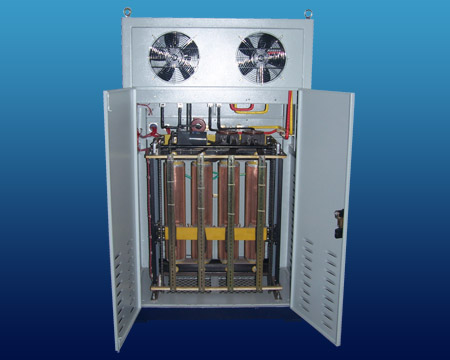 采用扁线绕制,单层线圈,叠片双柱铁芯,借助电刷在环形线圈磨光表面接触位置的改变,以达到平滑无调节输出电压的目的,配以同级电动调压器。
