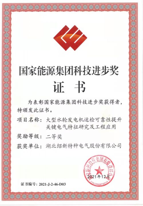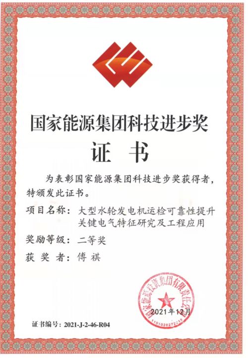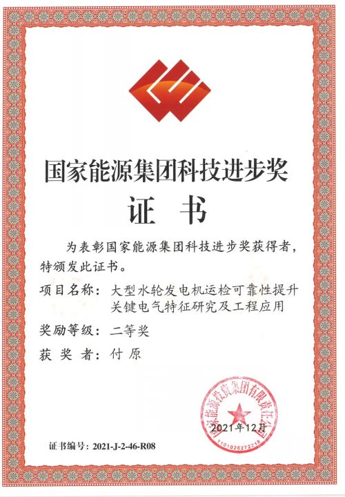 对伟德国际1946及付原、傅祺两名同志,在《大型水轮发电机运检可靠性提升关键电气特性研究及工程应用》项目完成中,所发挥的重要作用、取得的突出成绩给予奖励,并颁发国家能源集团科技进步二等奖证书。